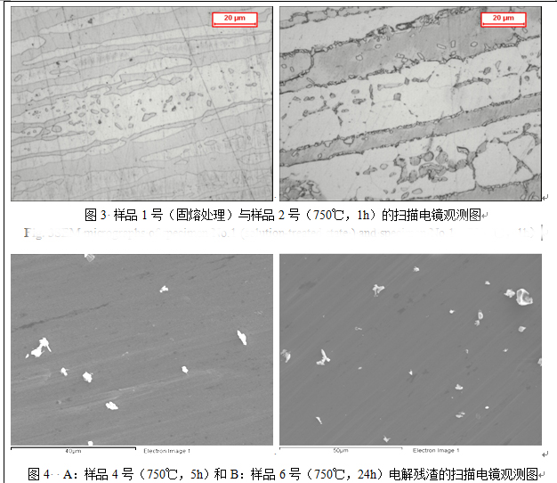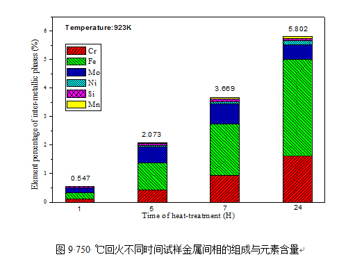 (4)實(shí)驗(yàn)考查了750 ℃回火不同時(shí)間試樣的不同析出相的組成與元素含量,從中可以看到,隨著回火時(shí)間的延長(zhǎng),金屬間相的含量呈明顯上升的趨勢(shì),從1H時(shí)的0.547 %上升到24H的5.802 %。在時(shí)效開(kāi)始時(shí)先形成金屬間相χ相,而隨著時(shí)間的延長(zhǎng),σ相逐漸形成并最終占主量。