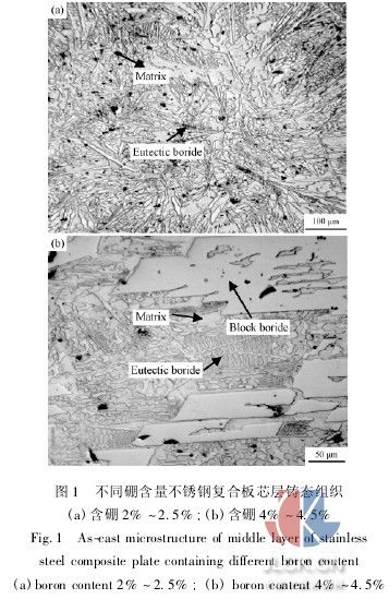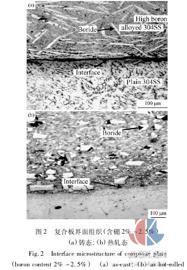 采用10kg真空熔煉爐在0.1kpa的真空條件下熔煉并澆鑄出3種不同硼含量的高硼不銹鋼芯料,將芯料置于澆鑄模內,從鑄模的上澆口中澆入作為覆層的普通不銹鋼,使之包覆在芯料周圍,制備出尺寸為120mm×100 mm×80mm,硼含量分別為2.0%~2. 5%、3.0%~3.5%、4.0%~4.5%的復合材料坯料。包覆澆鑄后的坯料在1150℃下經過鍛造及350型可逆熱軋機上的熱軋變形,軋制成最終厚度為3mm左右的不銹鋼復合板。軋制變形時,最初2道次的壓下量為20%~30%,使鑄態組織充分破碎,隨后壓下量降低至15%左右,每4~5個道次回爐重新加熱。