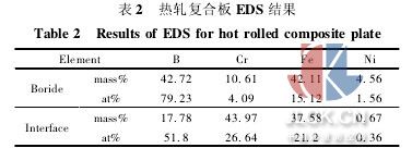 對熱軋后芯層中的硼化物及復合板界面處進行了eds分析,結果如圖3及表2所示。芯層中硼化物的b含量達到42.72%,原子分數達到79.23%,根據fe-b二元相圖[8],判斷該物相的成分中含有fe2b相。芯層中的硼化物除含有較多的fe 外,還含有一定量的cr、ni。cr元素由于是易形成碳化物的元素,而且具備生成cr-b化合物的熱力學條件,因此推斷該相中cr的存在形式有兩種: cr的碳化物和cr2b,綜上可知芯層塊狀硼化物的主要成分為: cr的碳化物,fe2b和cr2b。界面處硼含量較低,但cr含量較高,說明界面處的組織仍主要是α-fe基體相,但界面附近存在有少量由芯層越過界面擴散到覆層而形成的二次硼化物。